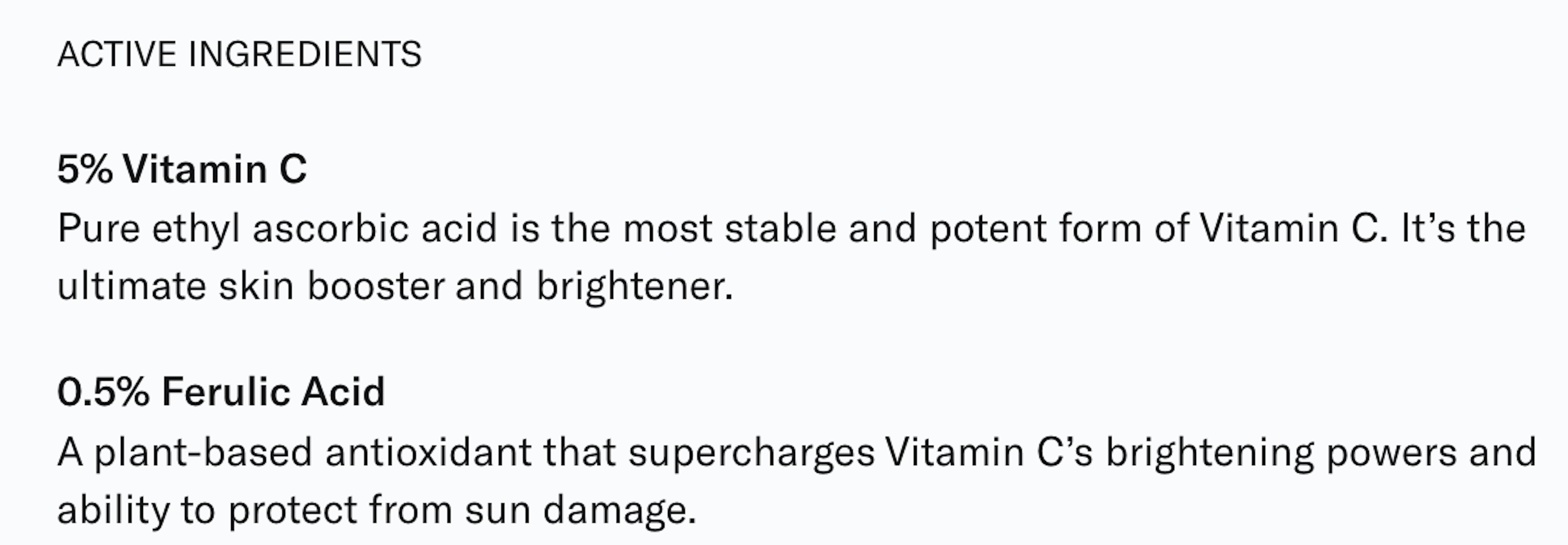 5% Vitamin C and 0.5% Ferulic Acid. It works great. I use it every morning.
